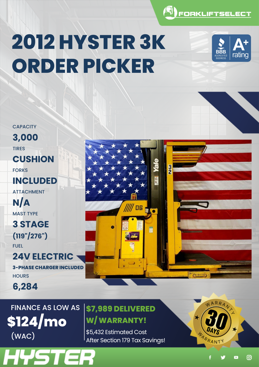 2012 HYSTER 3K CUSHION TIRE ORDER PICKER